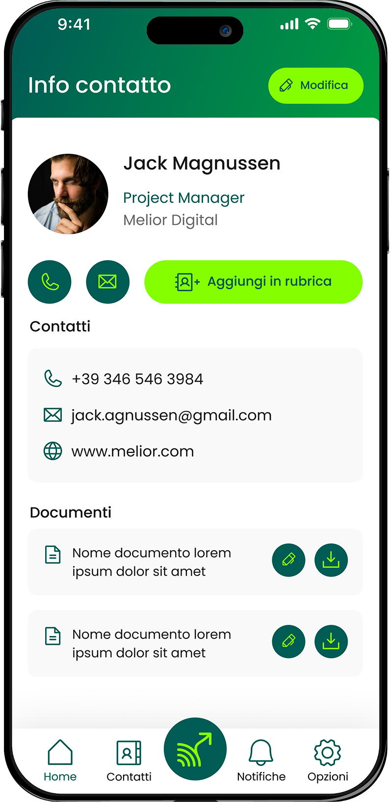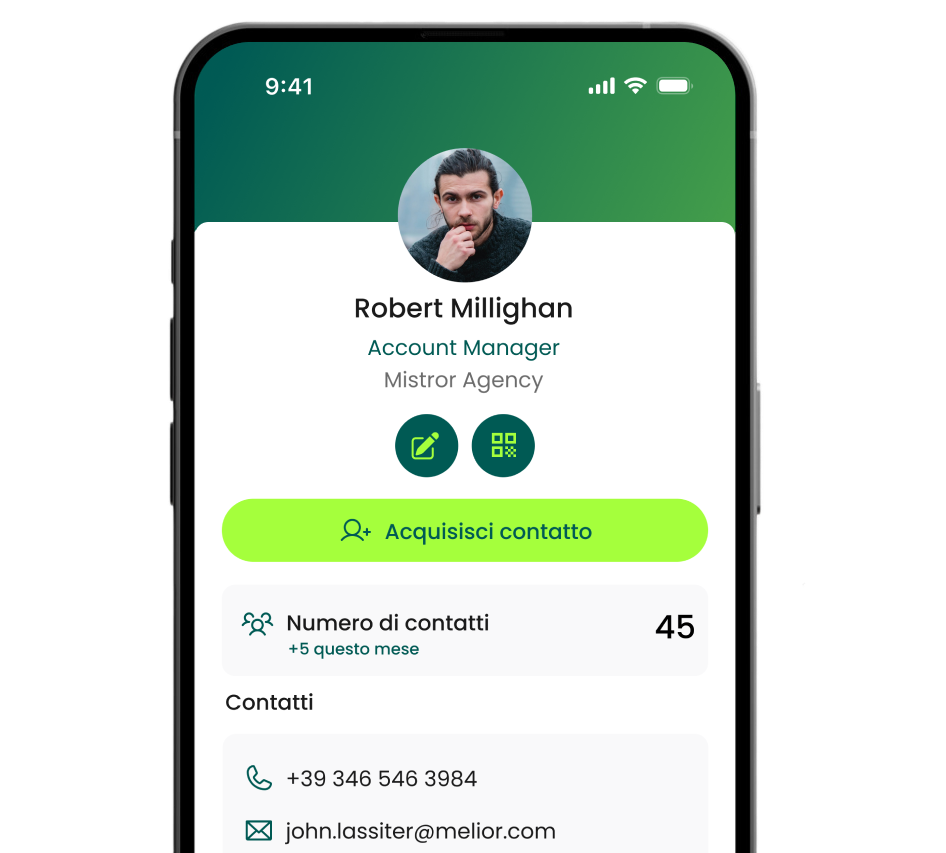 Tramite NFC e QR il tuo contatto sarà condiviso all’istante, senza installazioni per chi li riceve.