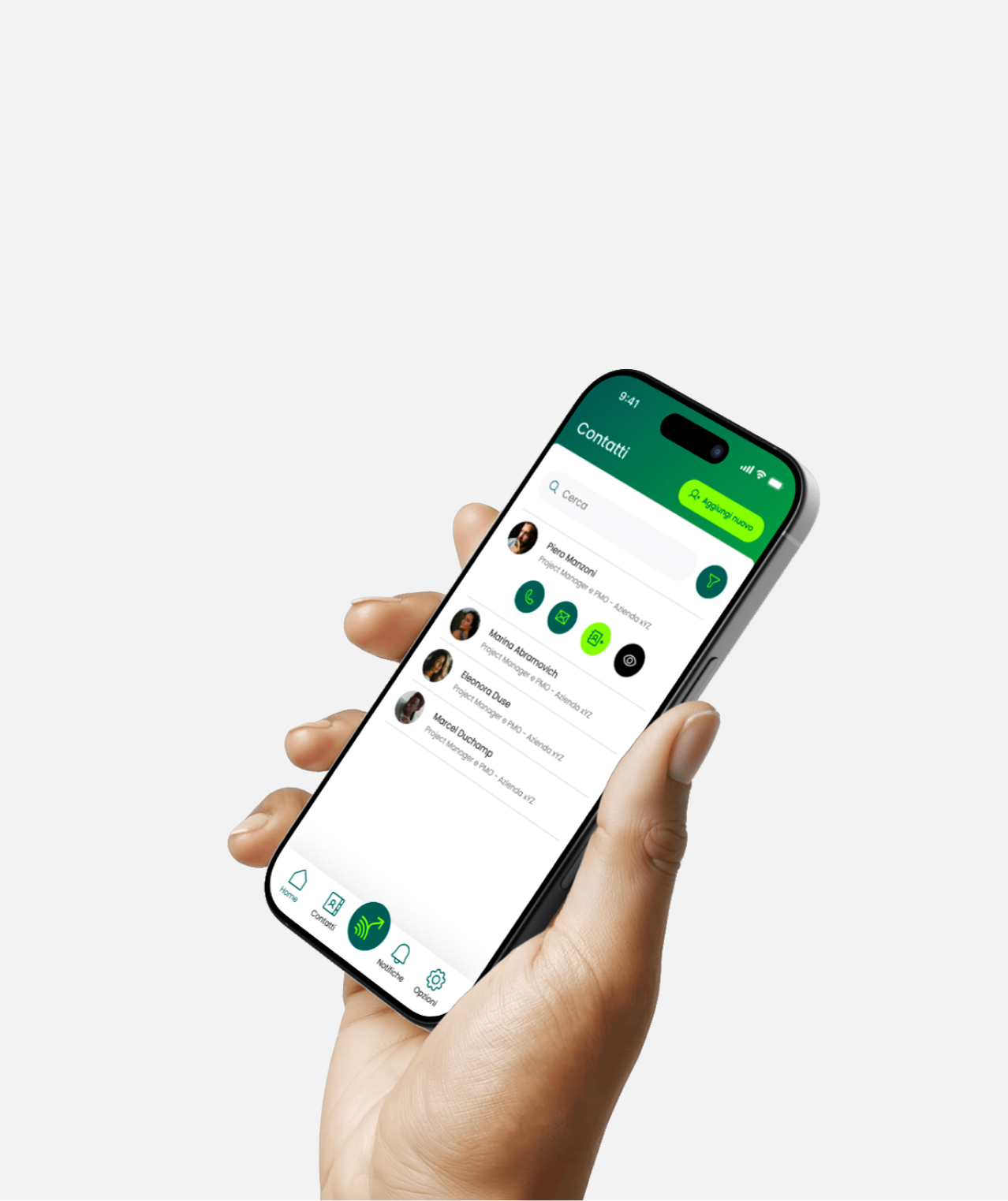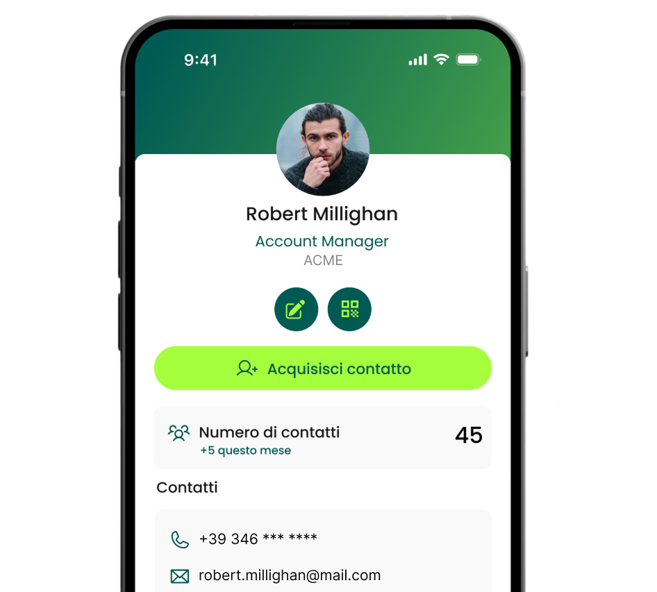 Tramite NFC e QR il tuo contatto sarà condiviso all’istante, senza installazioni per chi li riceve.